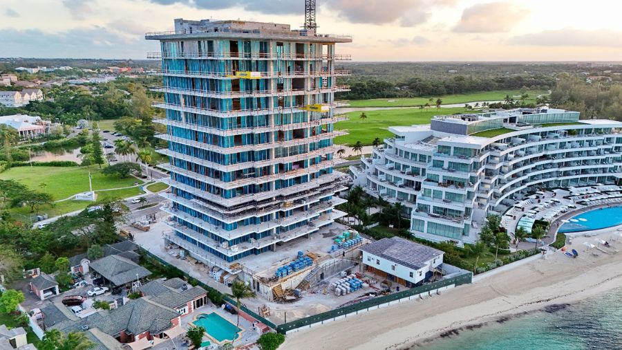 Externally, work remains concentrated on the pool deck, where construction and finishing activities are shaping the foundation of Phase 2’s private outdoor amenity spaces, including what will become Nassau’s only rooftop pool.